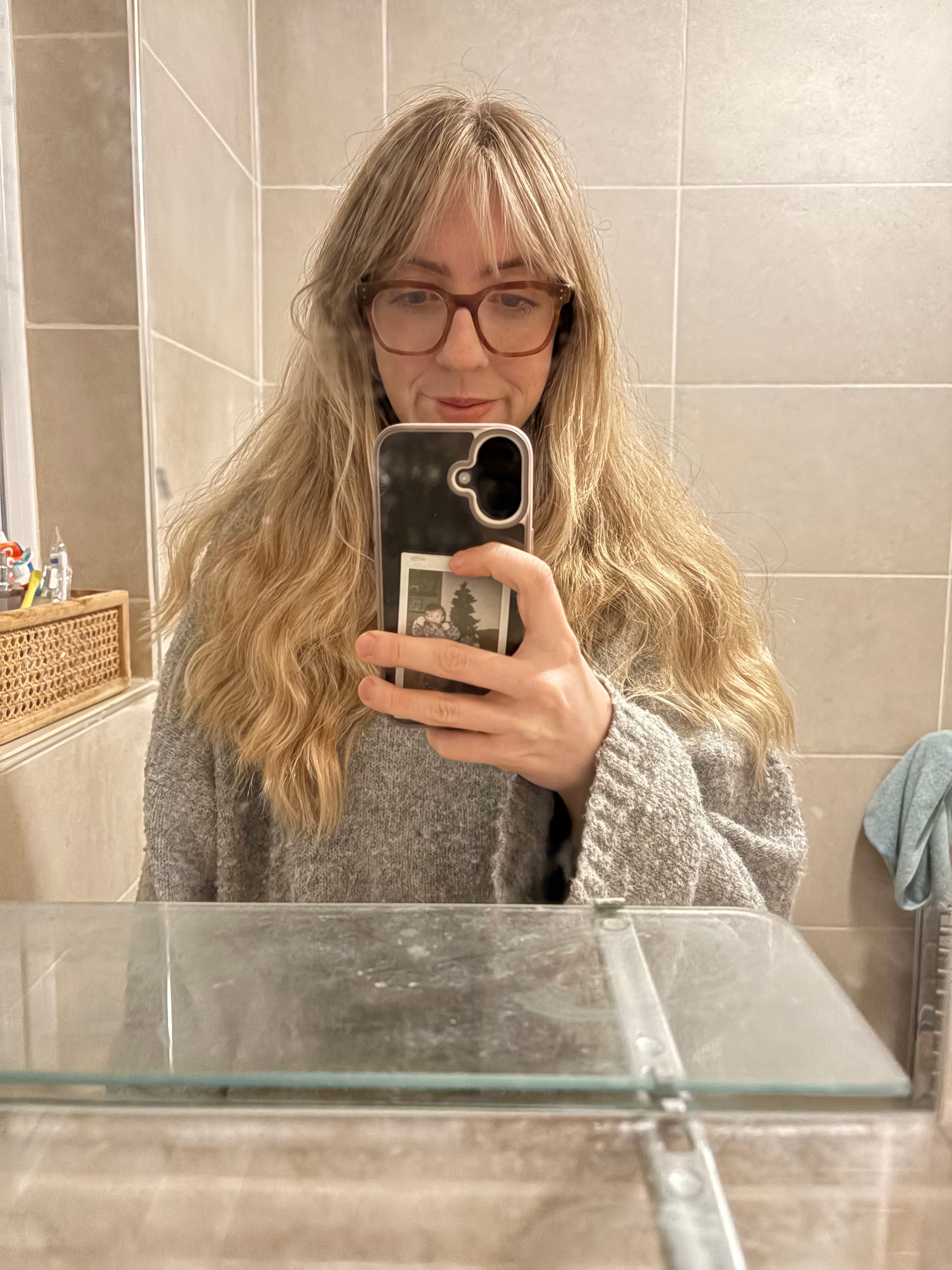 An update on the Jennifer Lawrence hair (featuring the grey baggy jumper I’ve actually been wearing every day.) I think I’ve figured out how to make the fringe maintenance, well, less maintained.